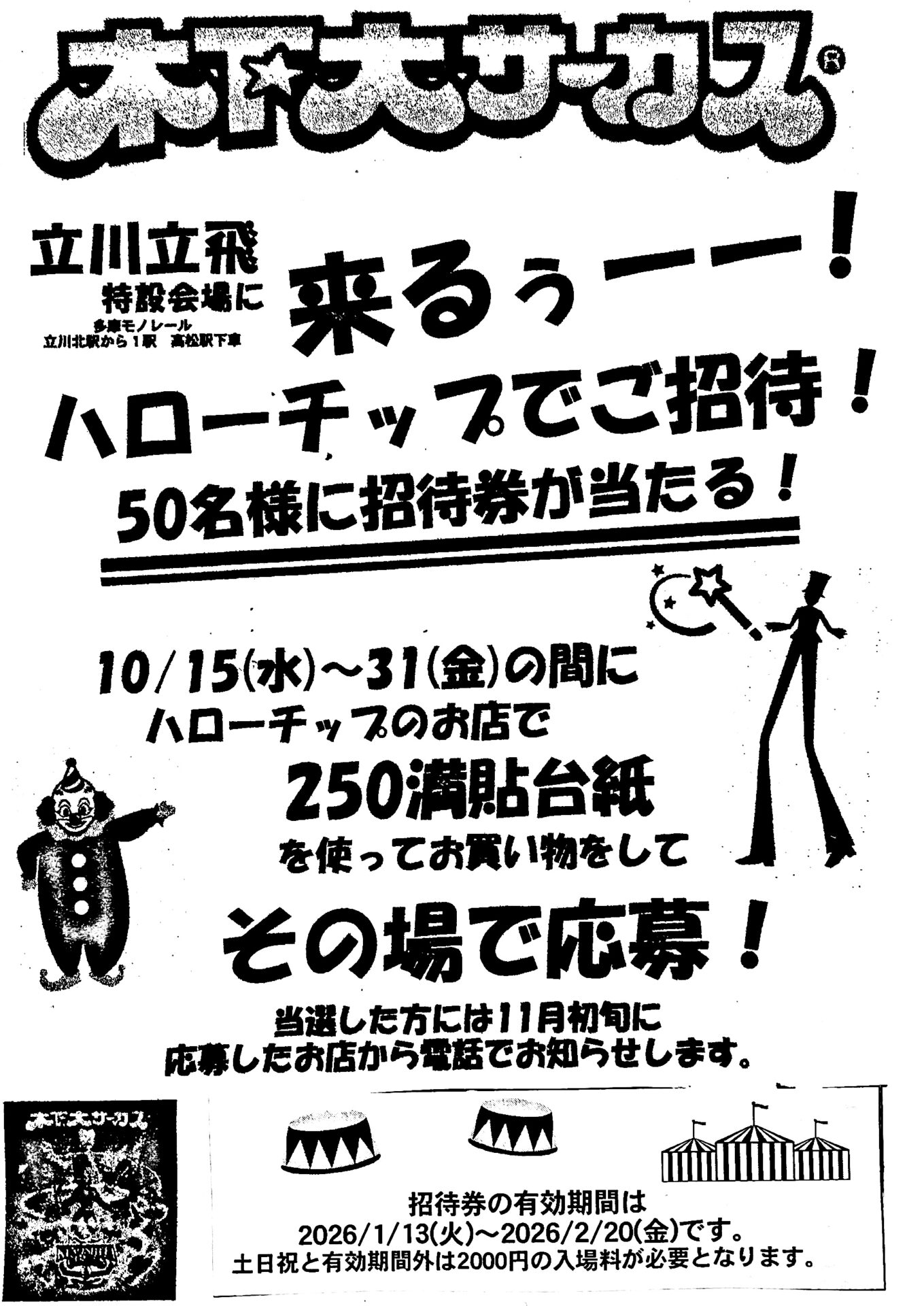 【10/15-31】ハローチップでお買い物をして木下大サーカス招待券当たります!