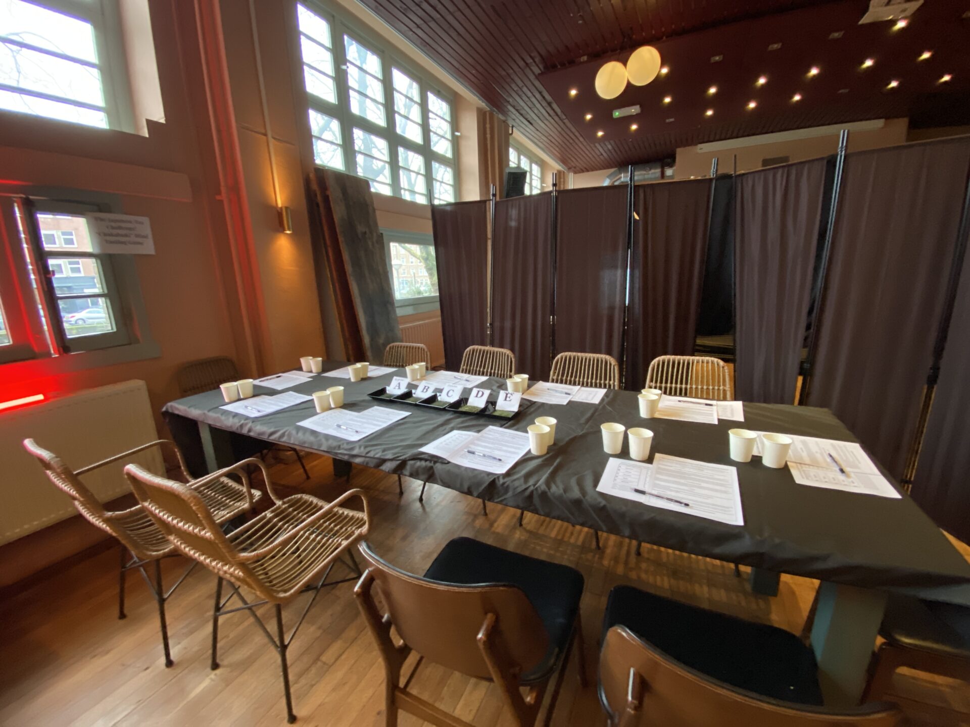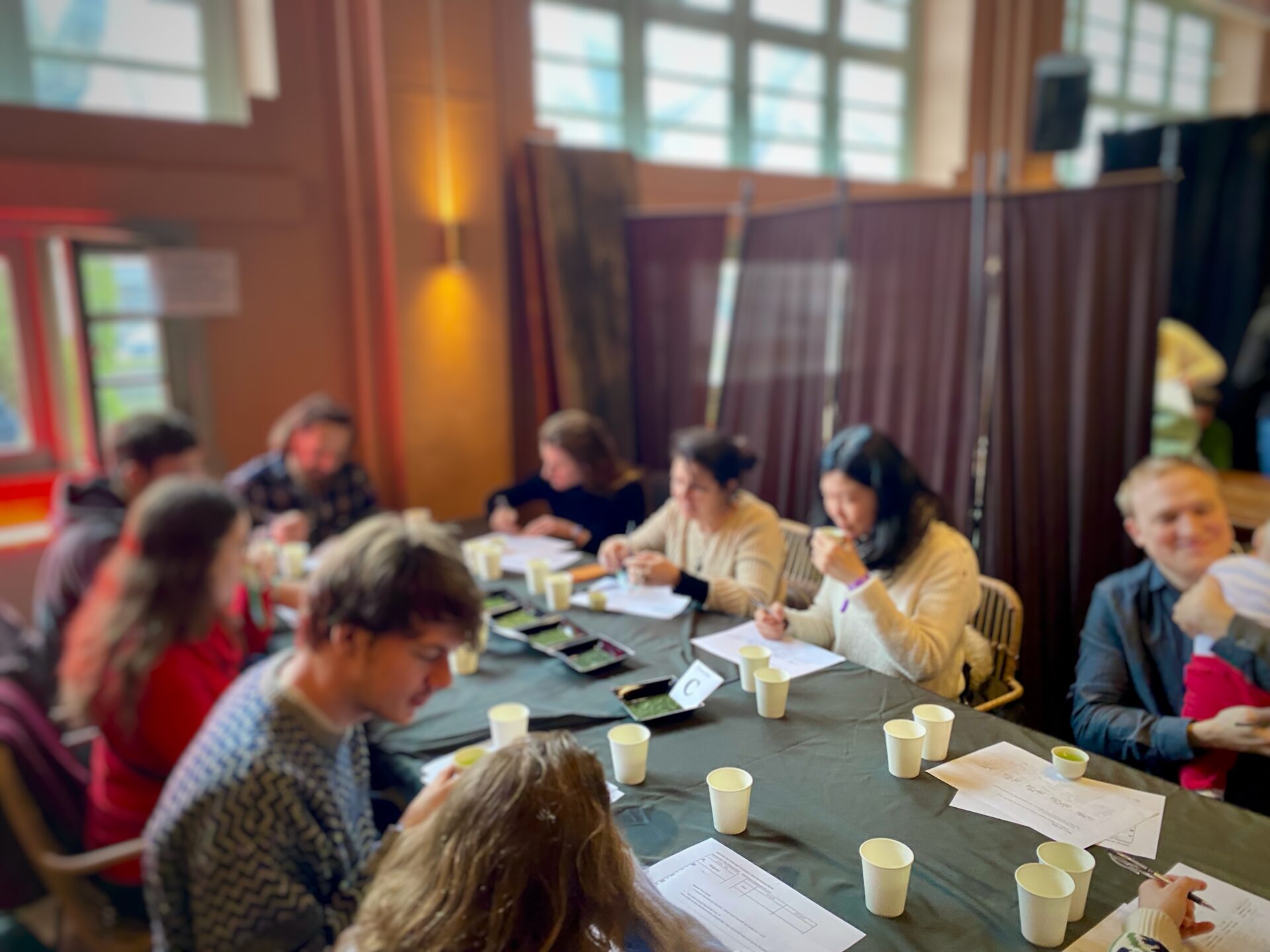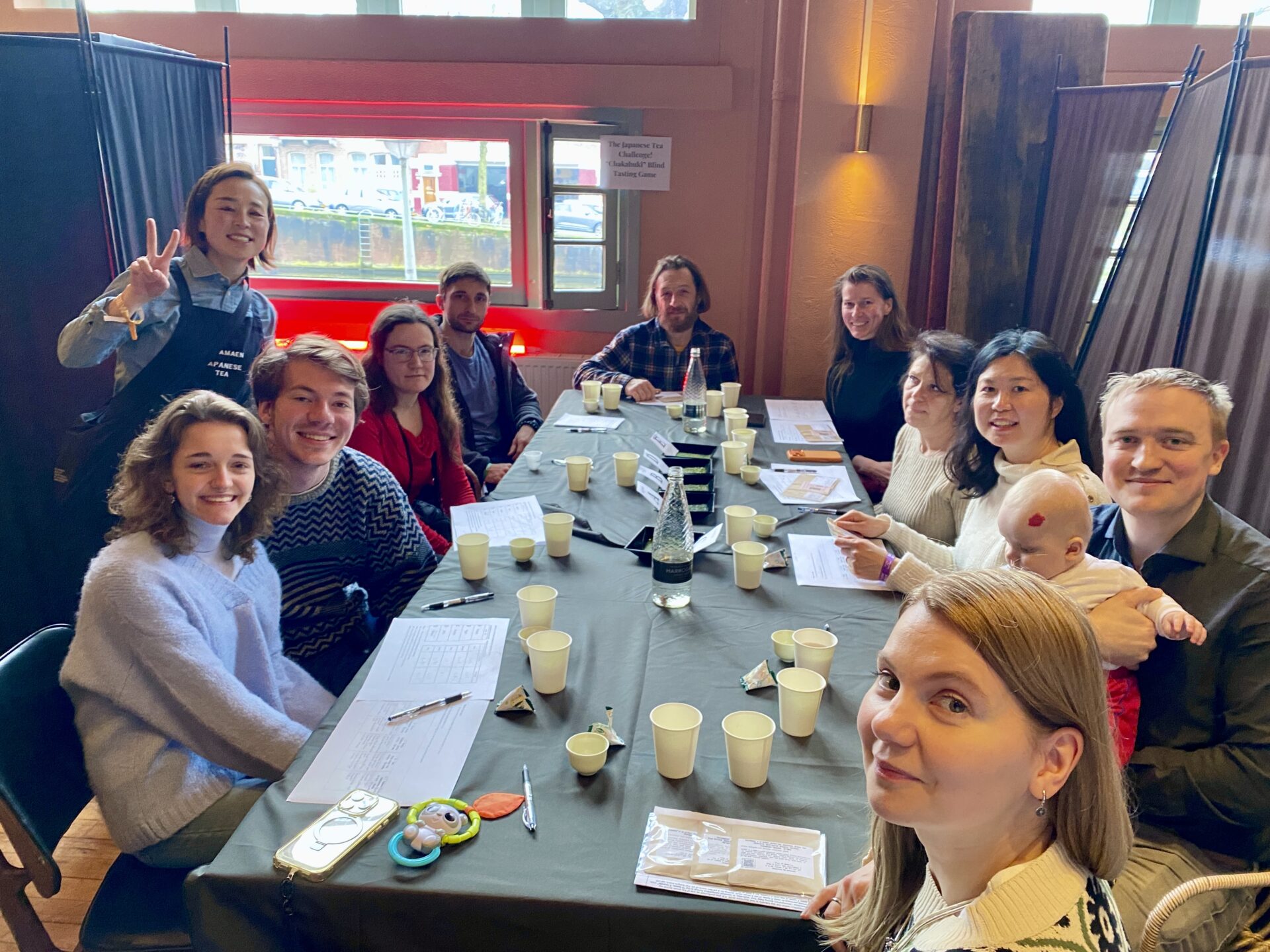 私たちは今回、「茶かぶき(闘茶)」という体験型ワークショップを企画し、10名の参加者とともに利き茶を行いました。オランダだけでなく、ドイツやルーマニアから来ている方、普段からお茶を日常的に飲んでいる、日本茶も味わったことがある方が多い印象で飲み比べ体験が盛り上がりました。(オランダは広く英語も通じ、コミュニケーションが取りやすい)