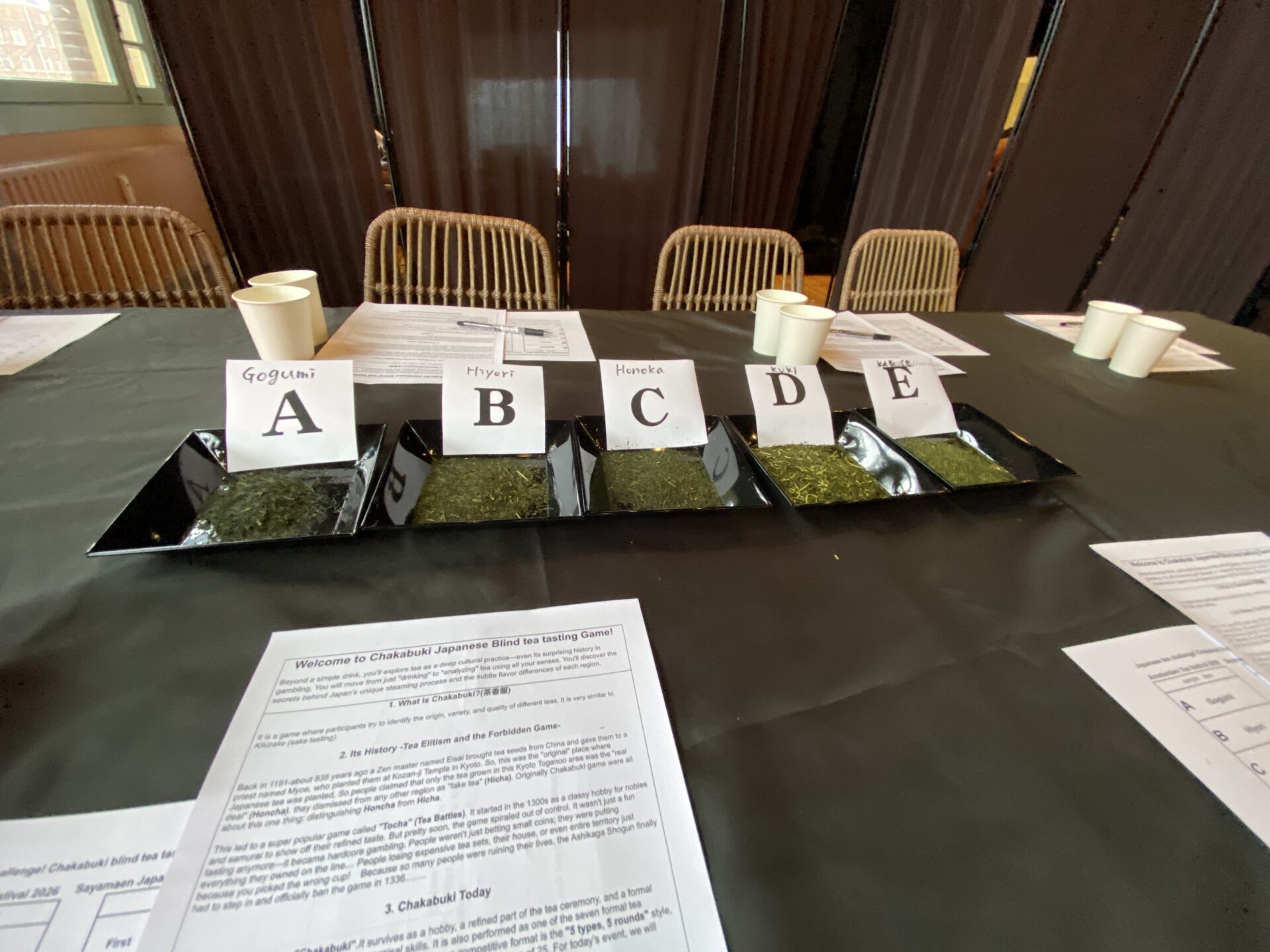 - 五感を研ぎ澄ます時間: 合組茶、狭山茶ほのか、深蒸し煎茶ひより、静岡茎茶、静岡玉露粉、5種類全て狭山園のお茶で揃え、それぞれの緑茶の個性を当てるこのゲームは、複雑な日本緑茶の味わいや香り、後味に至るまで五感を使った、集中の時間になりました。